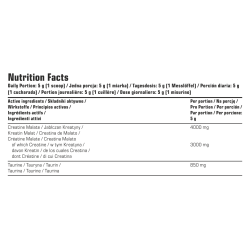 Składniki: jabłczan kreatyny (92%); tauryna; substancja przeciwzbrylająca: dwutlenek krzemu.